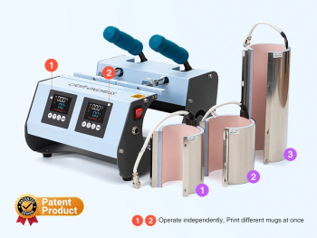 Оваа прецизна и високопродуктивна преса за чаши овозможува паралелно работење на две станици, што значително ја зголемува ефикасноста. Со можност за користење на три различни греачи (за 11oz, 9oz и 30oz skinny tumblers), оваа преса е идеална за професионални изработки, продавници и студија за персонализација. Цврста конструкција, прецизна контрола на температура и време, и удобен plug‑in систем за замена на греачи го прават овој уред веродостоен сојузник за вашата креативност.